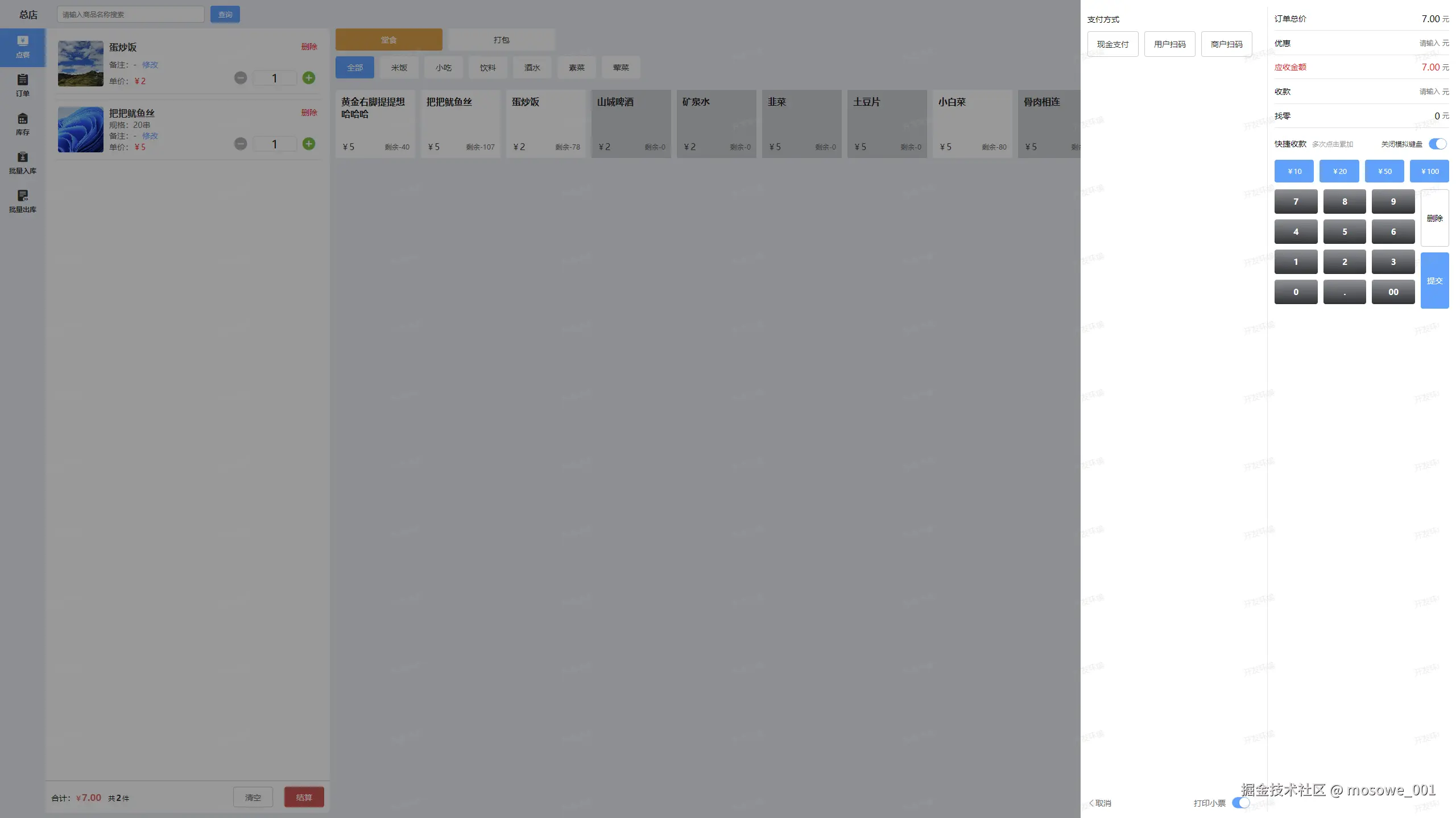 就这样,一个基础的简易版管理系统+收银台就这么出来了,这个时候的收银台还很丑,虽然借鉴了一些网上图片,但是还是很丑。