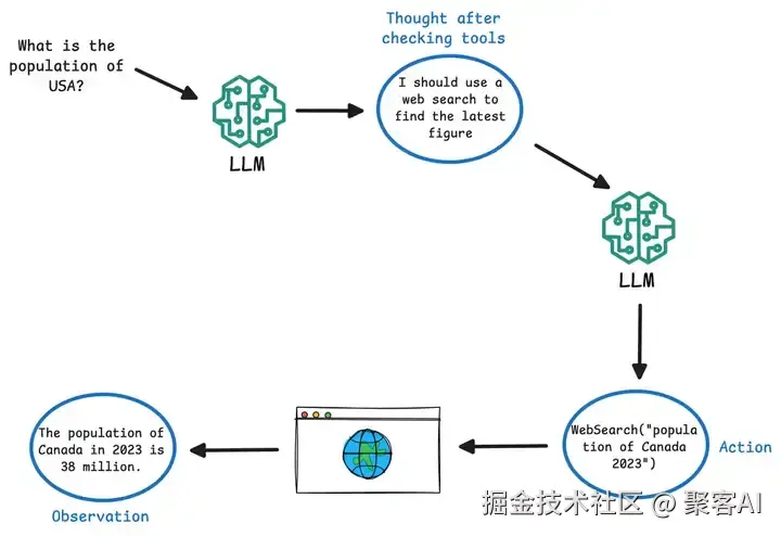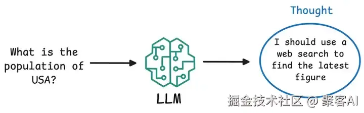 思考:由法学硕士 (LLM) 驱动的代理会分析用户的查询和内部语境,并用自然语言生成推理步骤。这通常不会向最终用户展示,而是代理自言自语的一部分。例如:“问题询问一个国家的人口数量;我应该使用网络搜索来查找最新数据。”