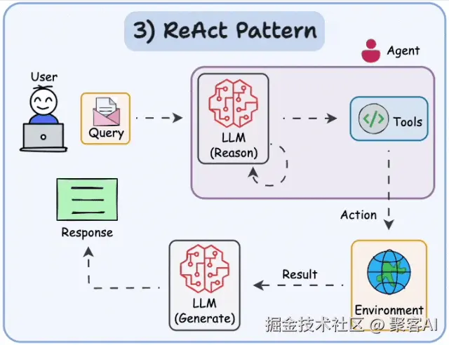 ReAct(Reasoning + Action)是一种让大语言模型(LLM)自主完成任务的核心架构。与传统直接生成答案的模式不同,ReAct 要求代理交替执行以下两步: