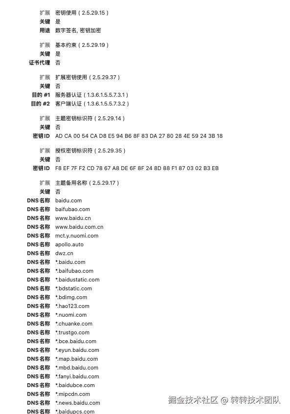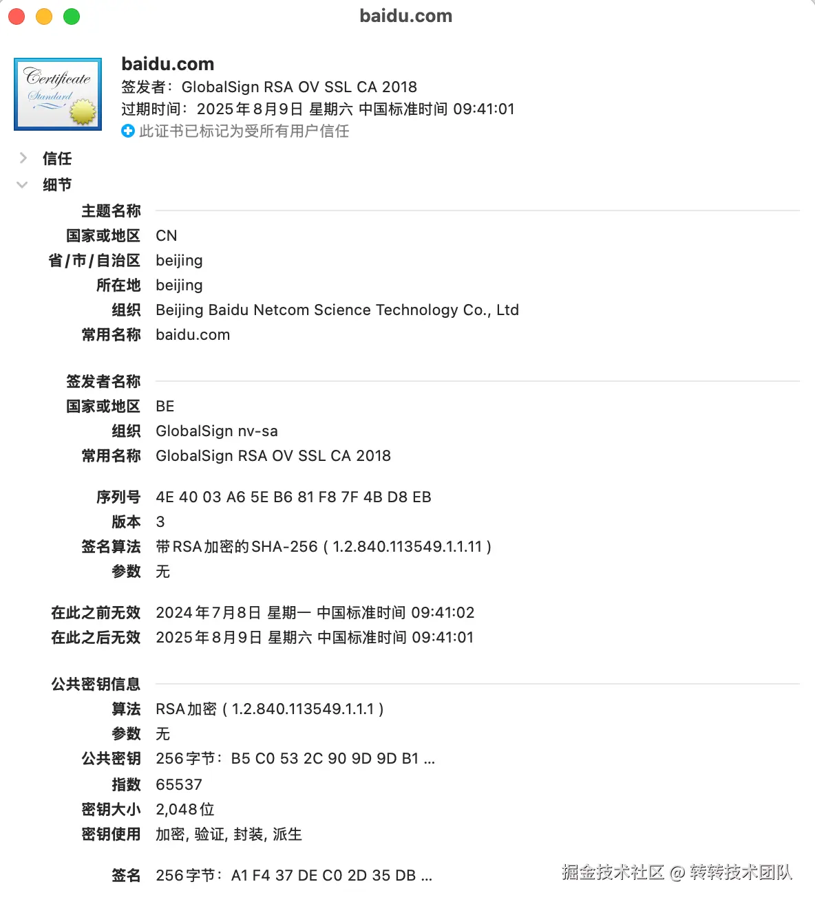 那么证书授权机构是如何解决证书网络传播的身份不确定问题的呢。所有合规的企业和具有完全民事行为能力的个人都可以申请CA数字证书。CA数字证书主要包含三部分。证书明文信息T(包含公钥、域名、企业信息)、摘要算法M和数字签名S。以百度的公开数字证书为例。如下图: