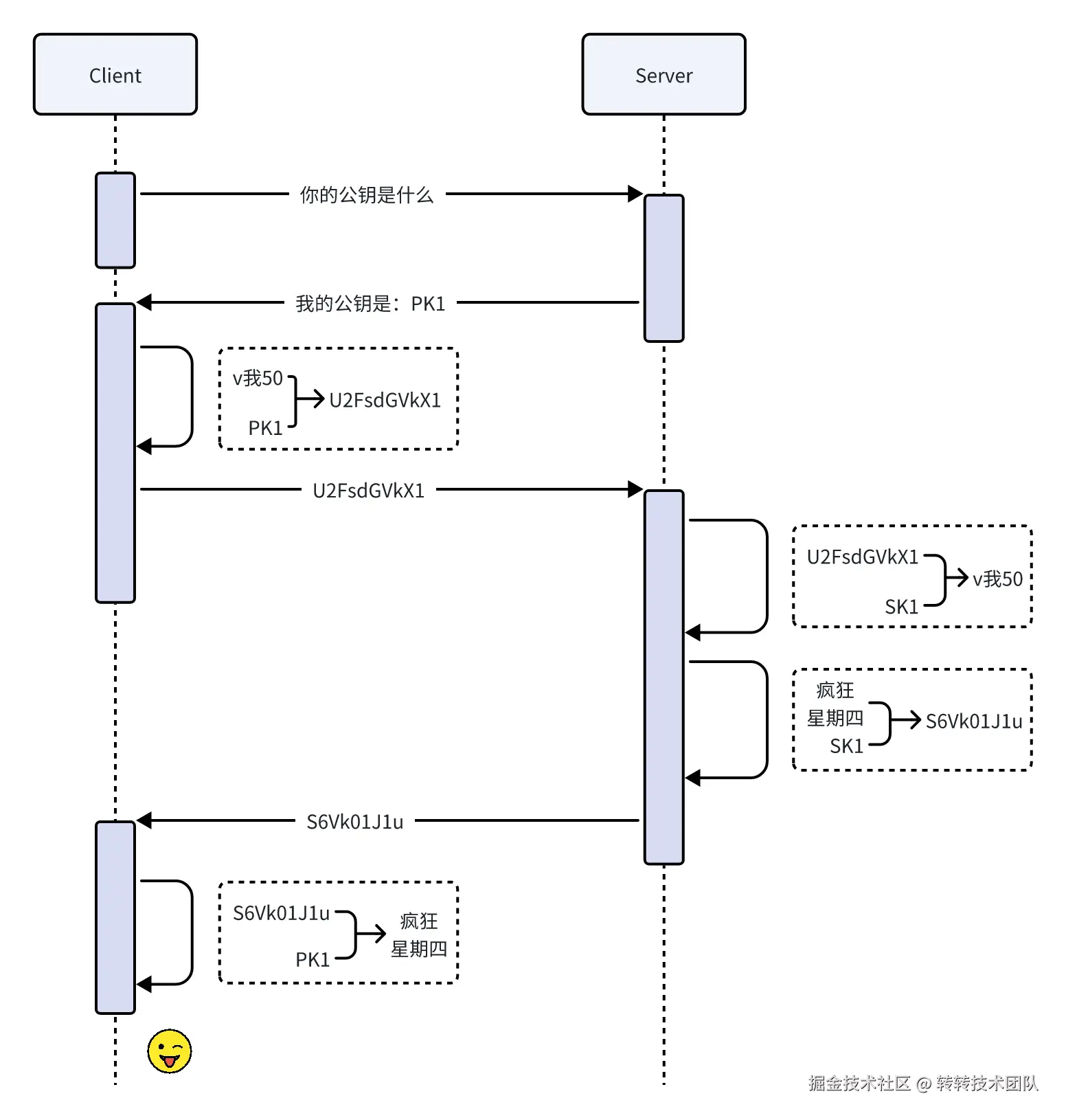 5.Client使用PK1加密消息【v我50】,生成密文【U2FsdGVkX1】,发送给Server