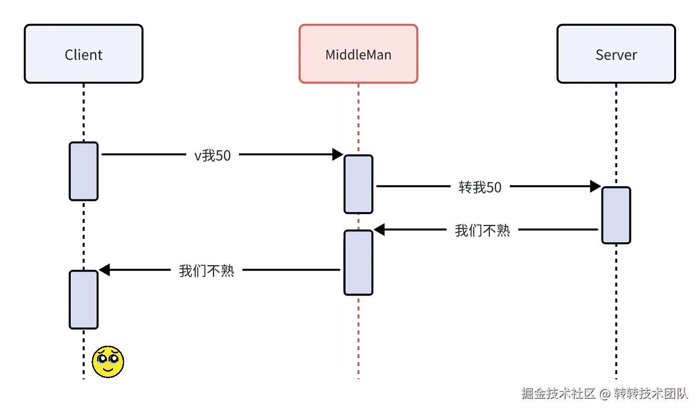 2.中间人MiddleMan劫持到消息后没有篡改消息,发送给了Server