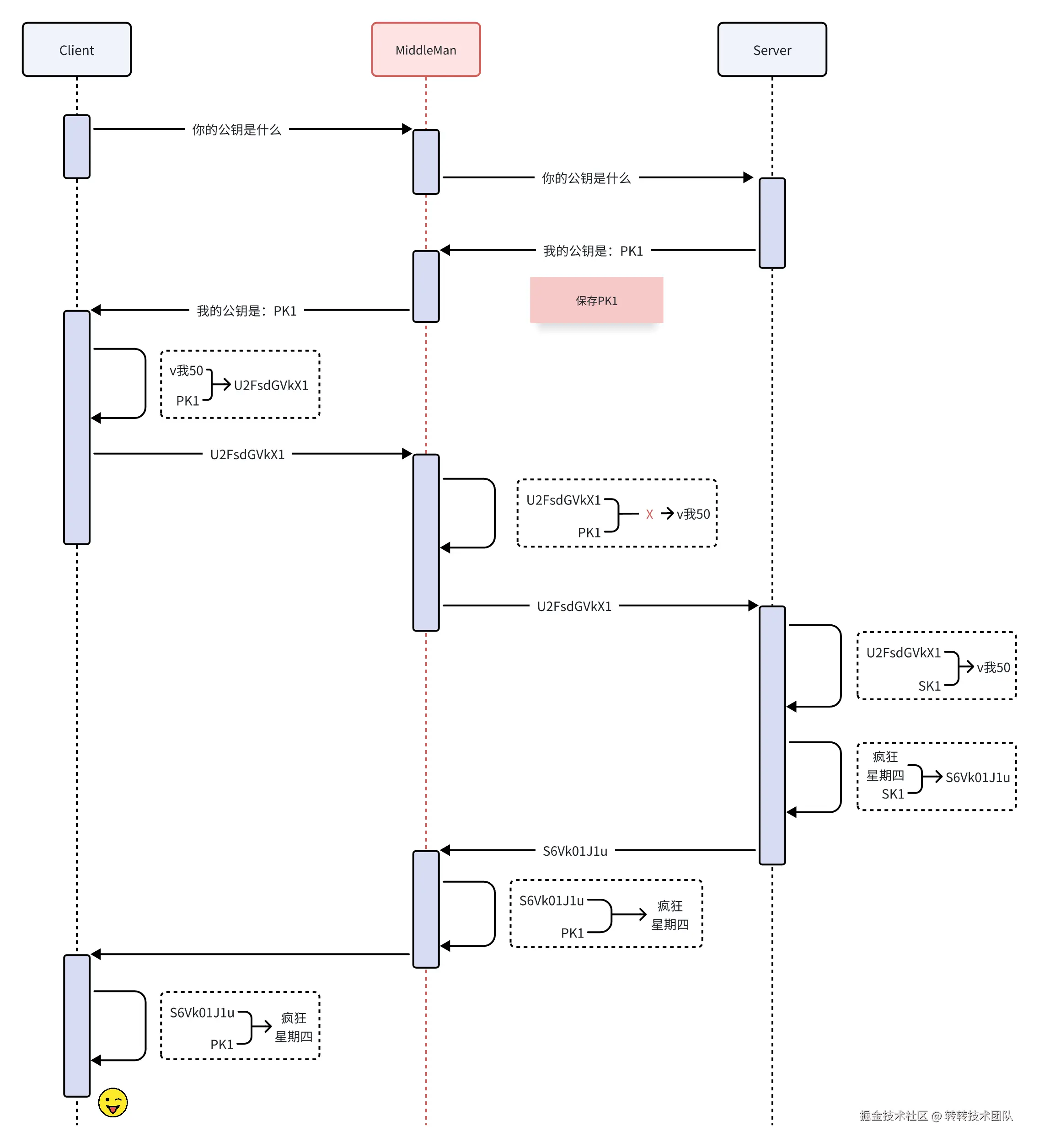 由于公钥是无限制公开的,那么中间人也可以正常拿到公钥PK1,此时中间人攻击过程可参考下图: