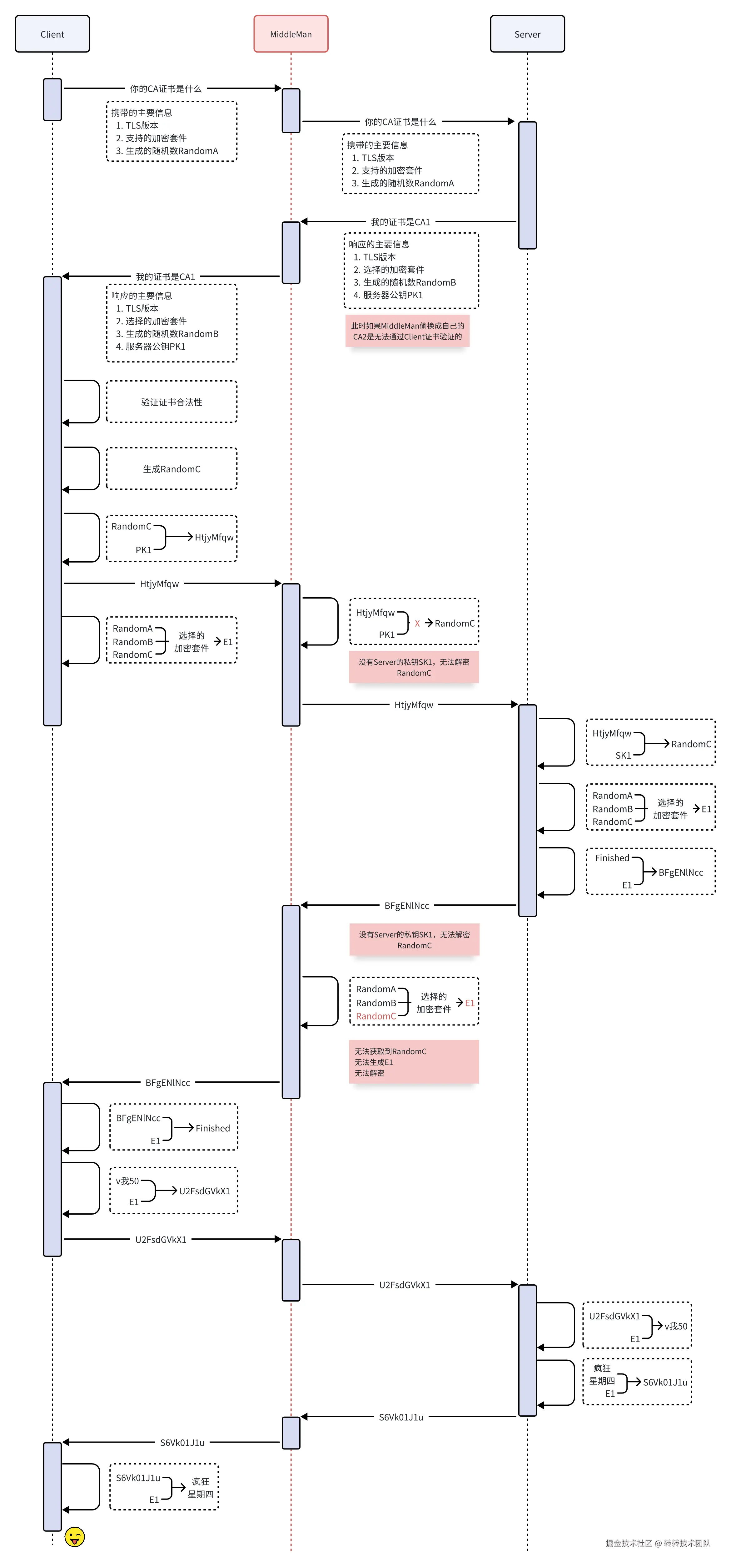 4.MiddleMan劫持到消息后,由于没有Server的私钥SK1,无法篡改信息,而如果将CA1偷换成自己的证书CA2,则无法通过Client的根证书合法性校验,所以只能将消息原样发送给Client。