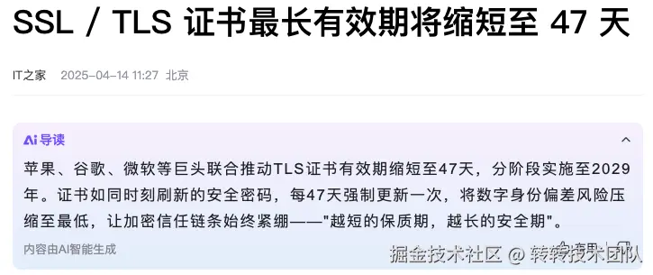 最近看到一篇IT之家的新闻,《SSL/TLS证书最长有效期将缩短至47天》