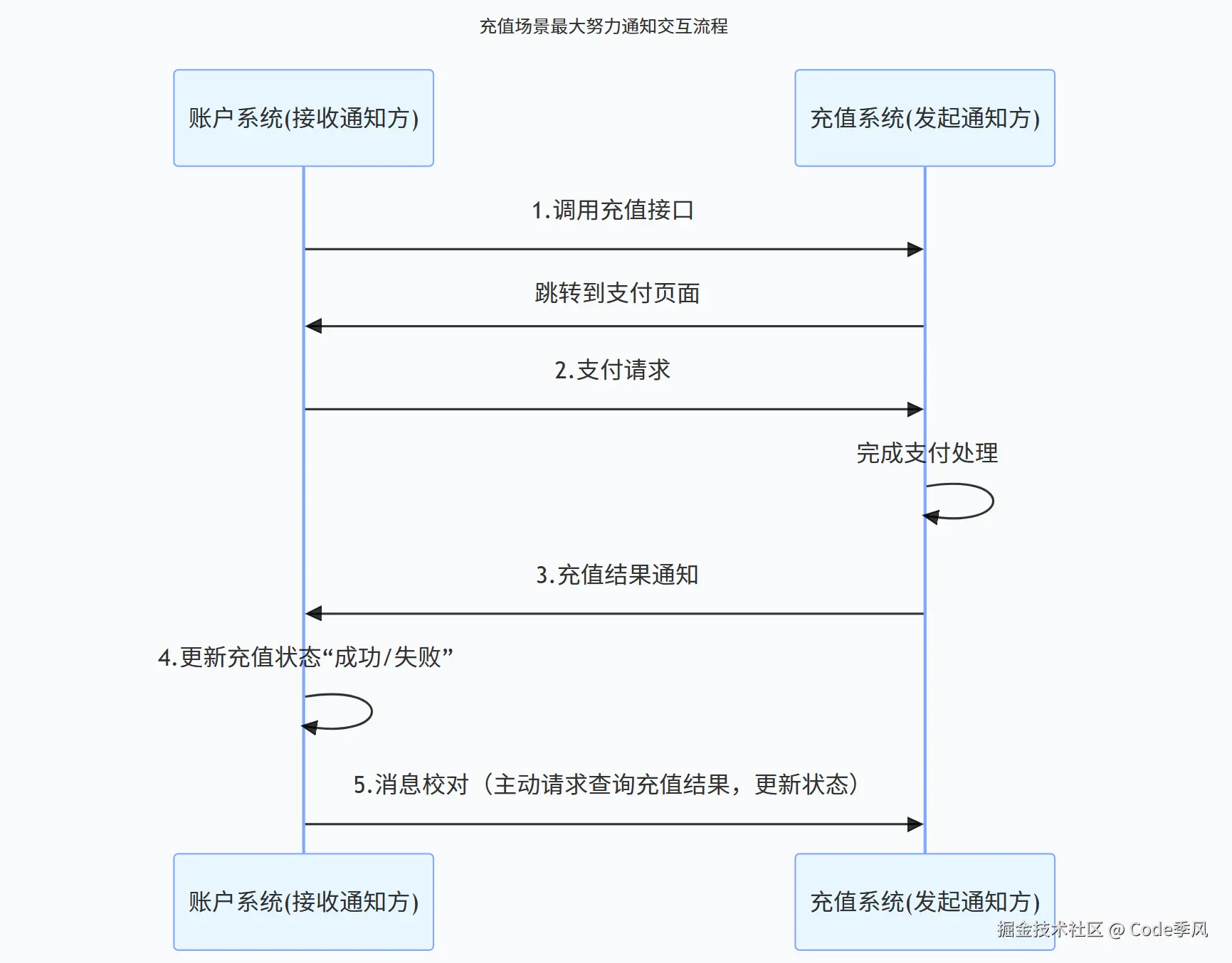 - 校对阶段:若通知失败,账户系统(接收方)主动查询充值系统,拉取最新结果。