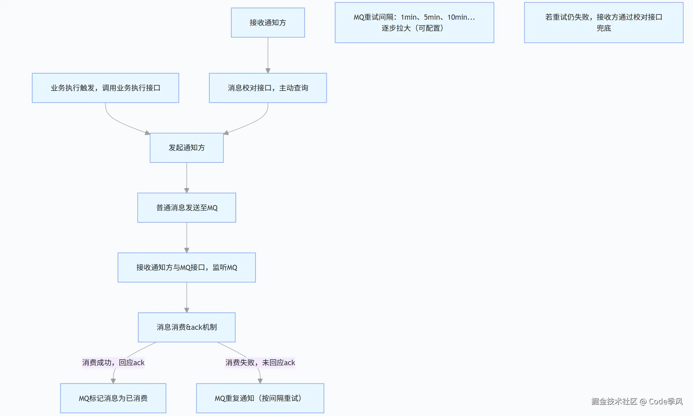 - 若调用失败,MQ 重试通知程序;通知程序也可自行实现重试(比如结合数据库记录通知状态 )。