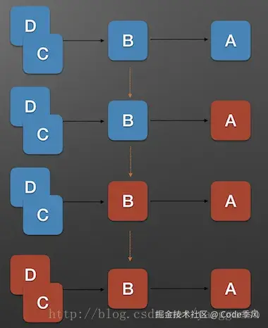 服务雪崩效应,是因服务提供者不可用,引发服务调用者不可用,并不断放大不可用范围的恶性现象 。比如 A 是服务提供者,B 调用 A,C、D 调用 B,当 A 故障,B 因依赖 A 不可用,C、D 也会受牵连,像多米诺骨牌般让故障范围蔓延。