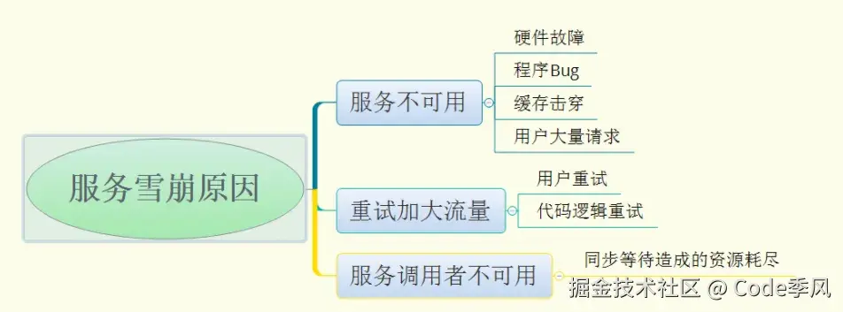 服务雪崩的形成分三个阶段,对应不同触发因素: