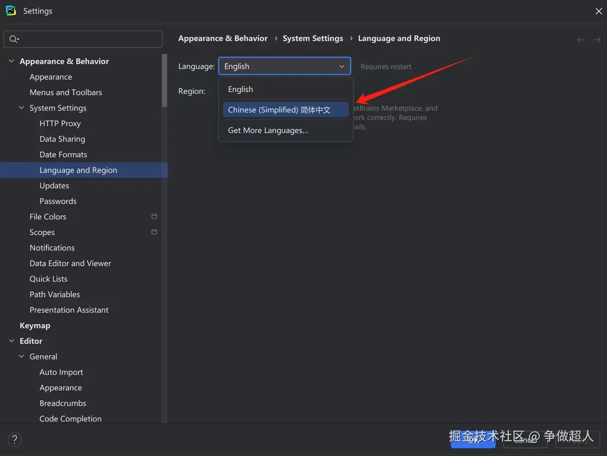 新版的工具,语言包已经内置了,通过快捷键:Ctrl + Alt + S, 打开设置。或者点击左上角 File —> Settings