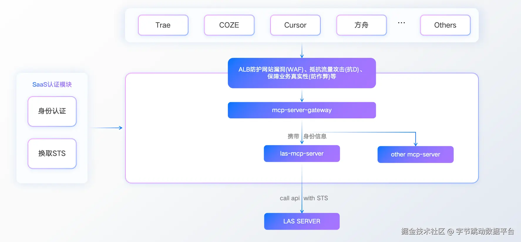Model Context Protocol (MCP) 是实现落地的关键技术。MCP是一套标准化数据上下文管理体系,其架构设计包含安全三层防护,用户请求经ALB应用负载均衡器过滤异常流量后,由网关动态路由至最近服务节点并签发STS安全令牌,最终实现私有数据的安全访问。