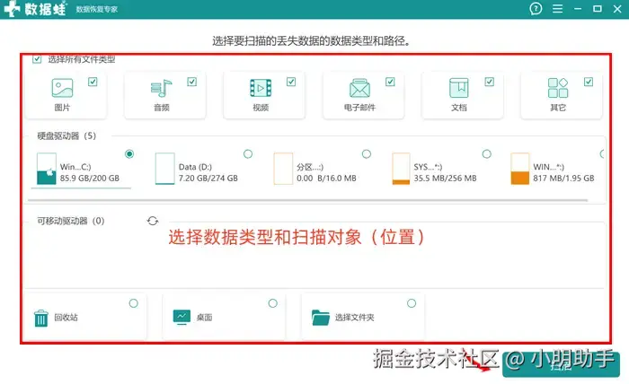 步骤1: 在软件首页中,选择数据的类型和扫描位置,最后按下按钮让软件开始进行扫描。