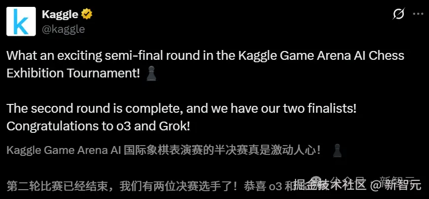 Kaggle Game Arena 上,谷歌举办的 AI 国际象棋表演赛中,Grok 4 和 o3 顺利挺进半决赛: