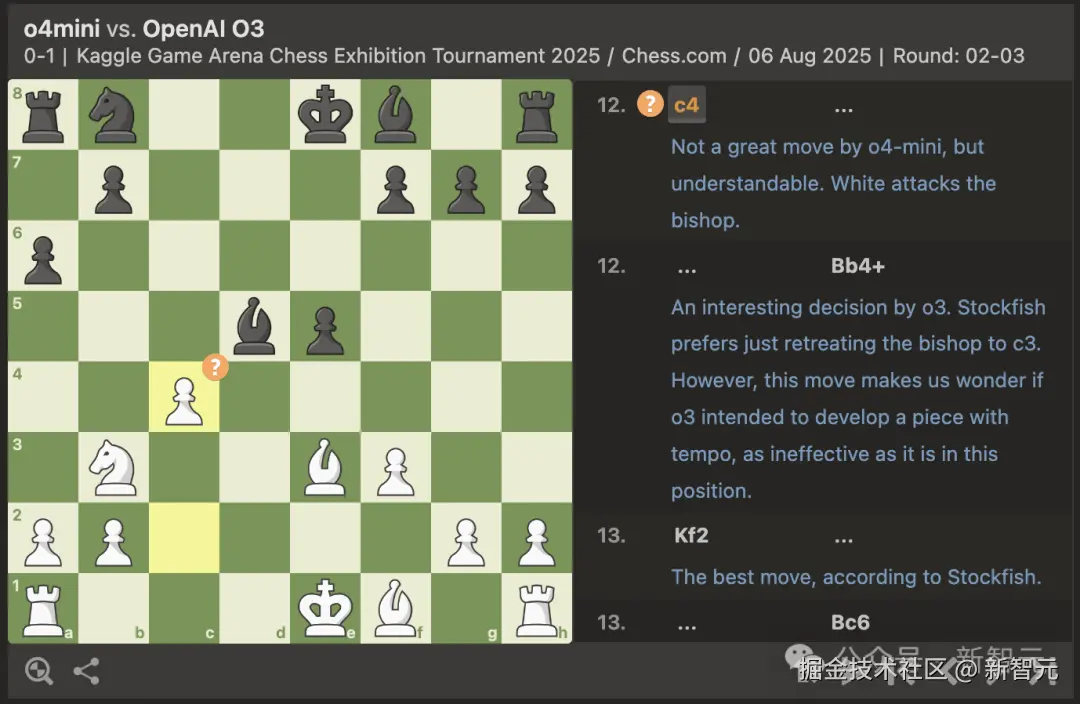 尤其是 o3 在棋局中完成的两个中间手(intermezzo)——12...Bb4 + 和 19...e3+,堪称本轮亮点。