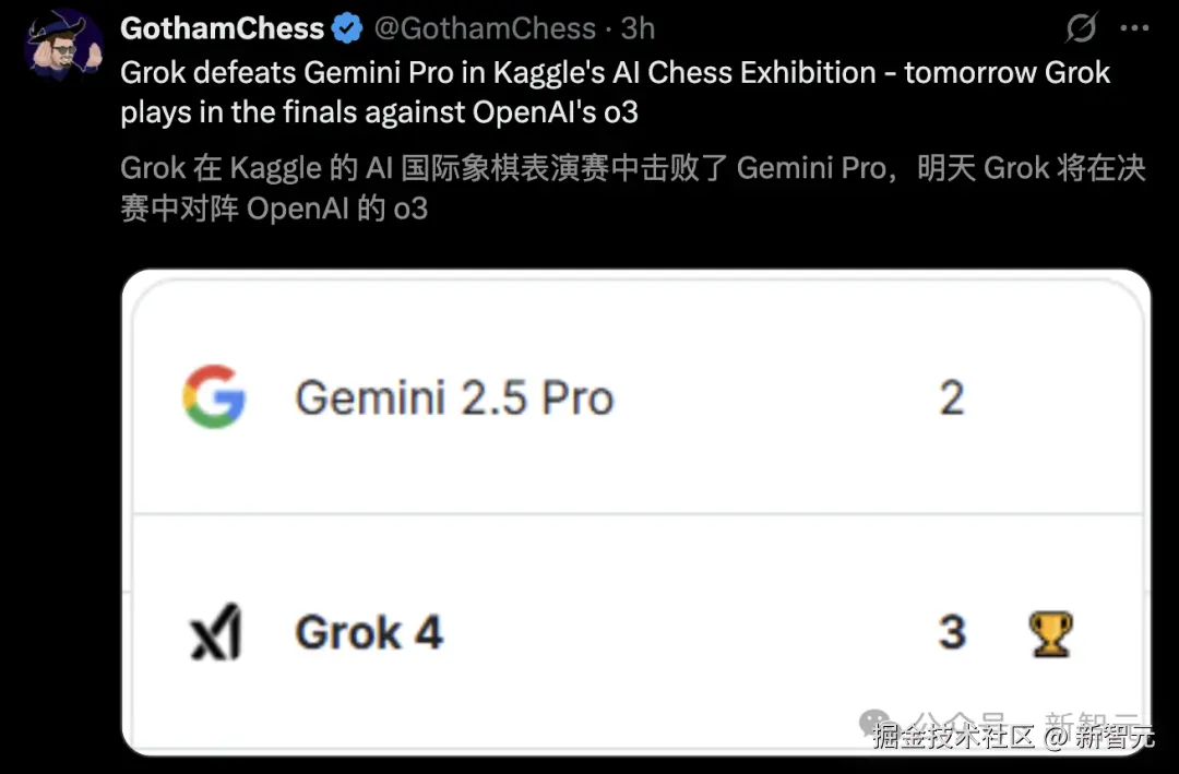 届时,国际象棋世界冠军 Magnus Carlsen 与英国三连冠棋手 David Howell 携手解说 Grok 4 对阵 o3 的巅峰对决。