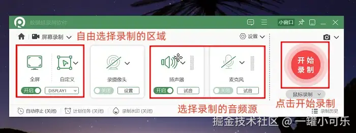 第2步:在软件的选项中,选择 “全屏录制” 或 “自定义区域录制” 。接着还能自主挑选适配的音频源。要是对录制视频的格式、帧率等有特定要求,还可以点击 “输出设置” 进行调整。设置好后,点击红色的 “录制” 按钮即可开始录屏。