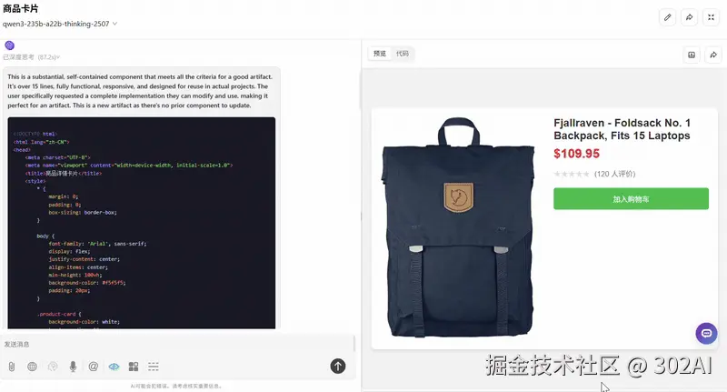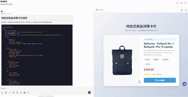 **DeepSeek-R1-0528:整体最佳。额外标注了星级评分和商品标签,点击“加入购物车”后还会触发“已加购”的交互设计。