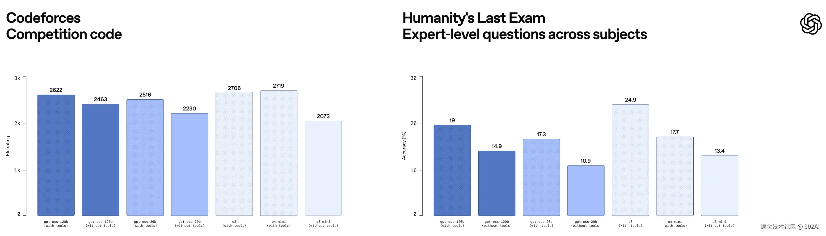 模型采用与 o4-mini 同级的强化学习流程训练,经 200 万小时 H100 算力淬炼,在权威测试中展现出突破性表现。OpenAI 公布的性能评估报告中显示,gpt-oss-120b 在核心基准测试中与 o4-mini 持平,并在数学竞赛题、健康类问题等特定领域表现更优;更小的 gpt-oss-20b 则与 o3-mini 相当,甚至在部分基准测试中超过后者。