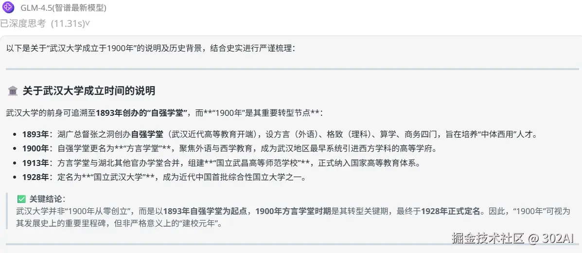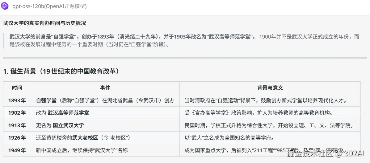 gpt-oss-120b:模型存在幻觉。虽纠正了正确创办时间,但其“1903年改名为‘武汉高等师范学堂’”的表述仍与下文【诞生背景】部分信息不符,自相矛盾。