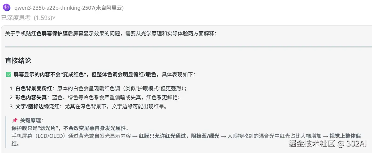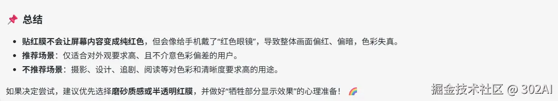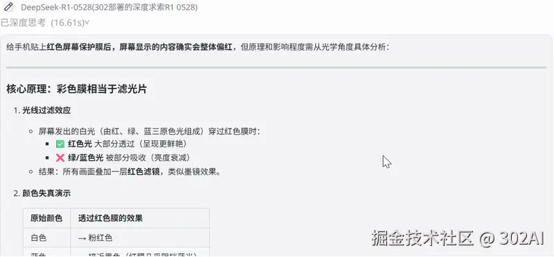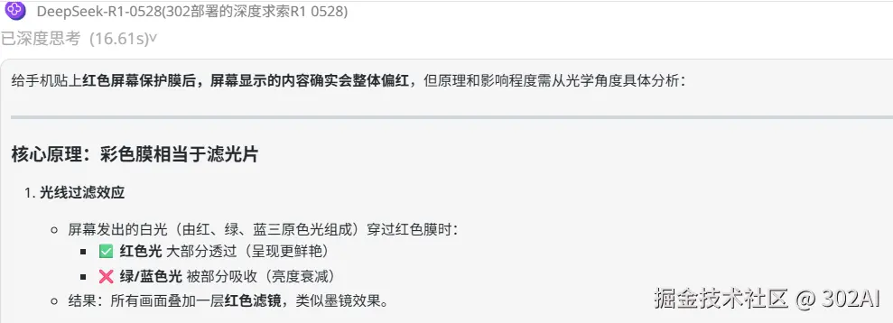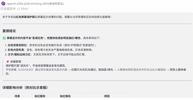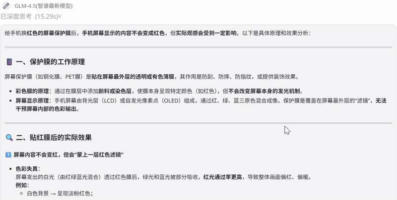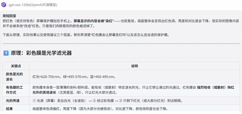 理想回答逻辑: 一个优秀的LLM需要理解,屏幕保护膜是透明的,其颜色来自于对特定波长光线的反射或吸收,而手机屏幕本身是主动发光源。因此,红色的膜会过滤掉其他颜色的光,使得屏幕整体看起来偏红、变暗,但不会将屏幕原本显示的图像内容(如一个蓝色的图标)直接“染成”红色。它应该能解释清楚“滤光”和“变色”这两个概念的区别。