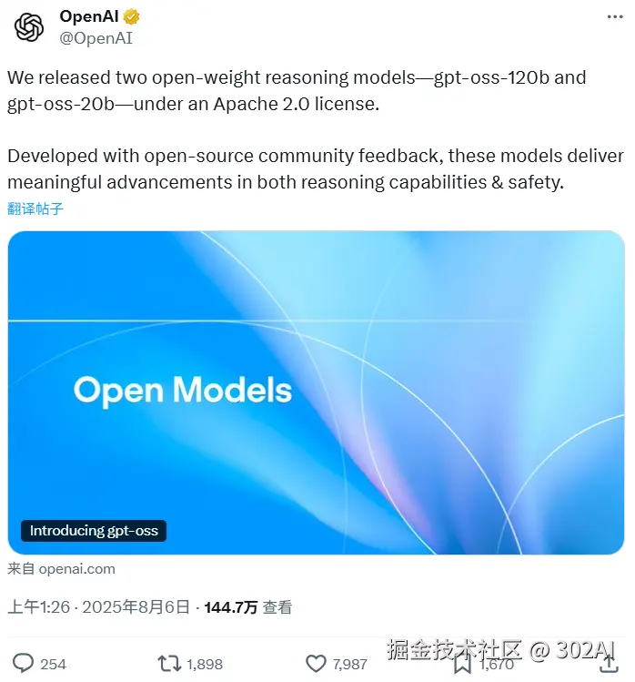 2025 年 8 月 5 日,OpenAI 突袭发布了两款全新的开源推理模型——gpt-oss-120b 和 gpt-oss-20b。这是 OpenAI 自 2019 年 开源 GPT-2 以来,时隔 6 年首次重返开源生态。