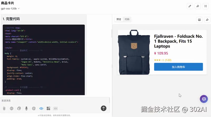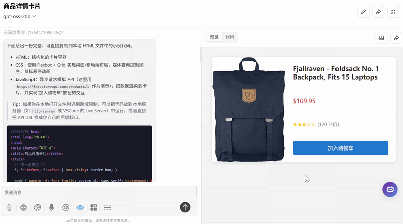 提示词: “请创建一个响应式的商品详情卡片组件。你需要使用HTML和CSS(建议使用Flexbox或Grid布局),并用JavaScript从一个模拟的API接口获取商品数据并动态渲染到卡片上。