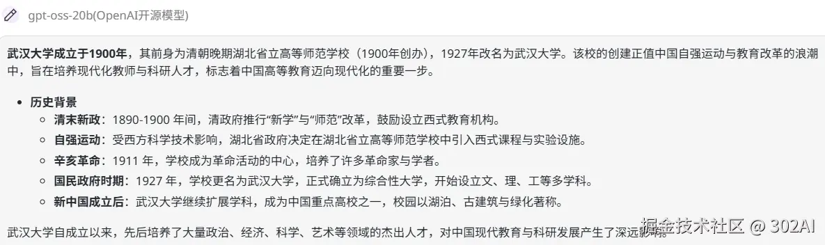 gpt-oss-20b:模型存在幻觉。 受题目干扰默认了“武汉大学成立于1900年”的虚假信息。