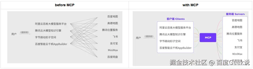 MCP(Model Context Protocol),模型上下文协议,由Anthropic于24年11月提出,旨在为大语言模型和外部数据源、工具、服务提供统一的通信框架,标准化AI与真实世界的交互方式