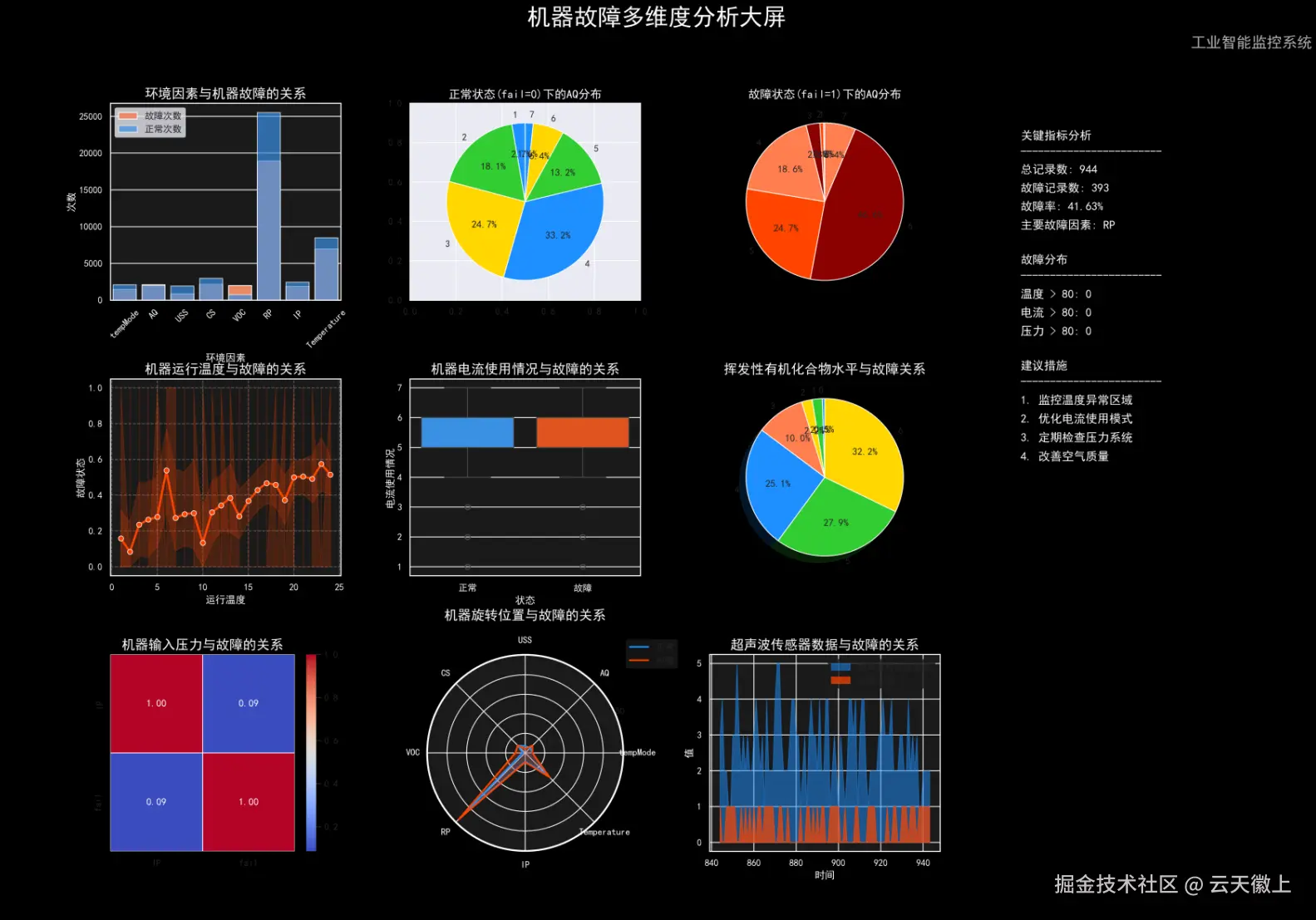 在工业生产中,机器的性能和故障率受到多种环境因素的影响。本文将利用 Python 和 matplotlib 对环境因素对机器性能的影响进行深度可视化分析。通过多种炫酷的图表,从多个维度深入剖析环境因素与机器性能之间的关系,最终生成一个可移动的可视化大屏,为数据分析和决策提供有力支持。