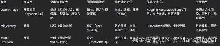 以下表格对比了Qwen-Image与Midjourney和Stable Diffusion在开发者关注点上的异同: