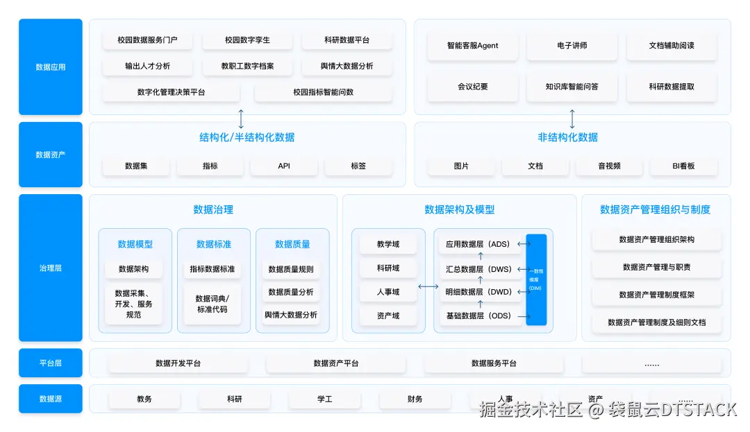 这五层架构相互支撑、逐层增值,形成了从原始数据到最终价值的完整转化链路,旨在系统性解决高校在数据应用方面面临的普遍痛点。