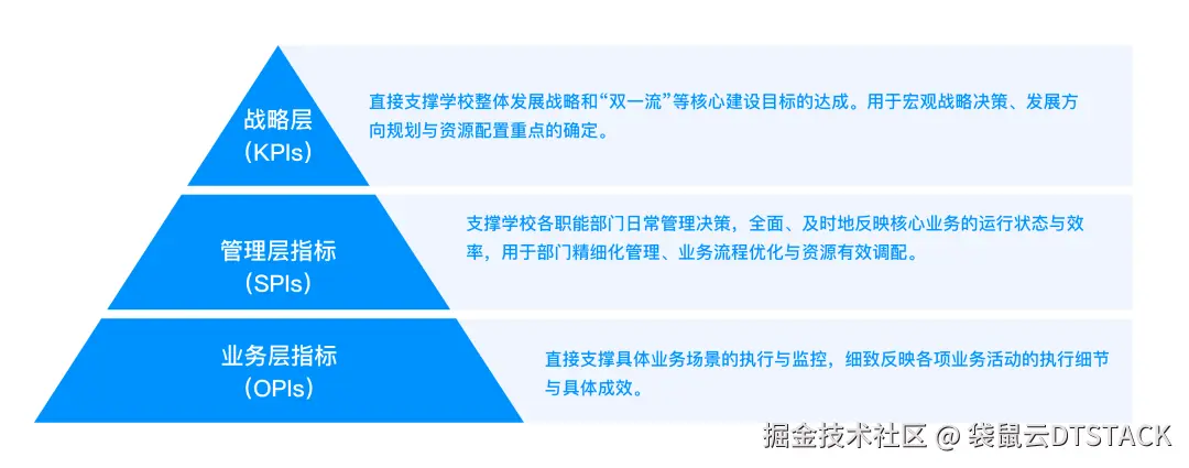 指标是衡量业务绩效、洞察业务规律、驱动业务改进的关键载体,是连接原始数据与业务决策的桥梁。本方案致力于构建一个多层次、全覆盖、高度结构化的高校指标体系: