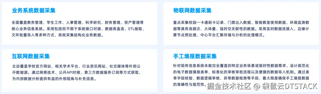 高校数据来源广泛且结构各异,包括核心业务系统数据、物联网感知数据、外部互联网数据以及部分手工填报数据。本方案致力于构建一个能够覆盖并整合这些多样化数据源的全面采集体系: