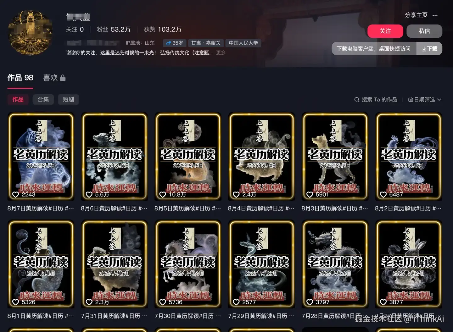 最近有没有在抖音上刷到这种老黄历解读视频?古风背景配上黄历运势分析,加上浑厚男声 解说,短短15秒就能斩获上万点赞。