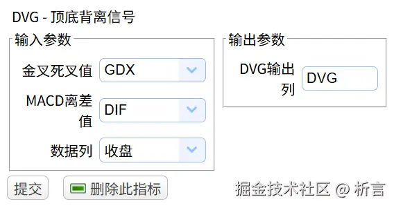 在指标类型下拉框中选择DVGMACD-MACD 顶底背离信号,数据列和中长短周期均用缺省值,DVG 输出列填DVGMACD: