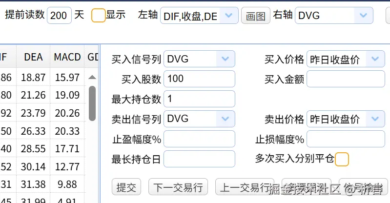 提交后,在买卖信号列下拉框中选择DVGMACD,买入股数填100,最大持仓数填1,买卖价格选择昨日收盘价: