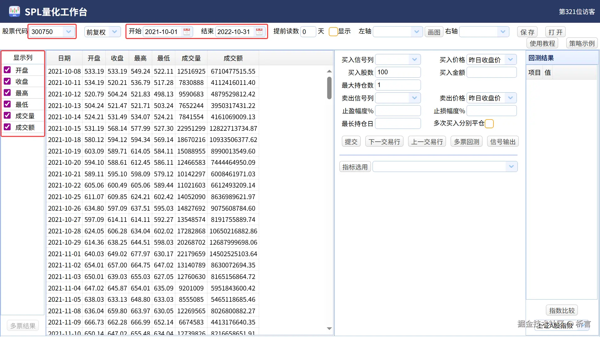 左侧可以勾选需要显示的指标,尝试选择开盘、收盘、最高、最低、成交量等基本数据。这里可以自由选择时间范围。可以选择 2021 年 10 月至 2022 年 10 月的数据,因为宁德时代在这个时间区间有过一次比较典型的顶背离和底背离事件,这样回测可以验证一下。