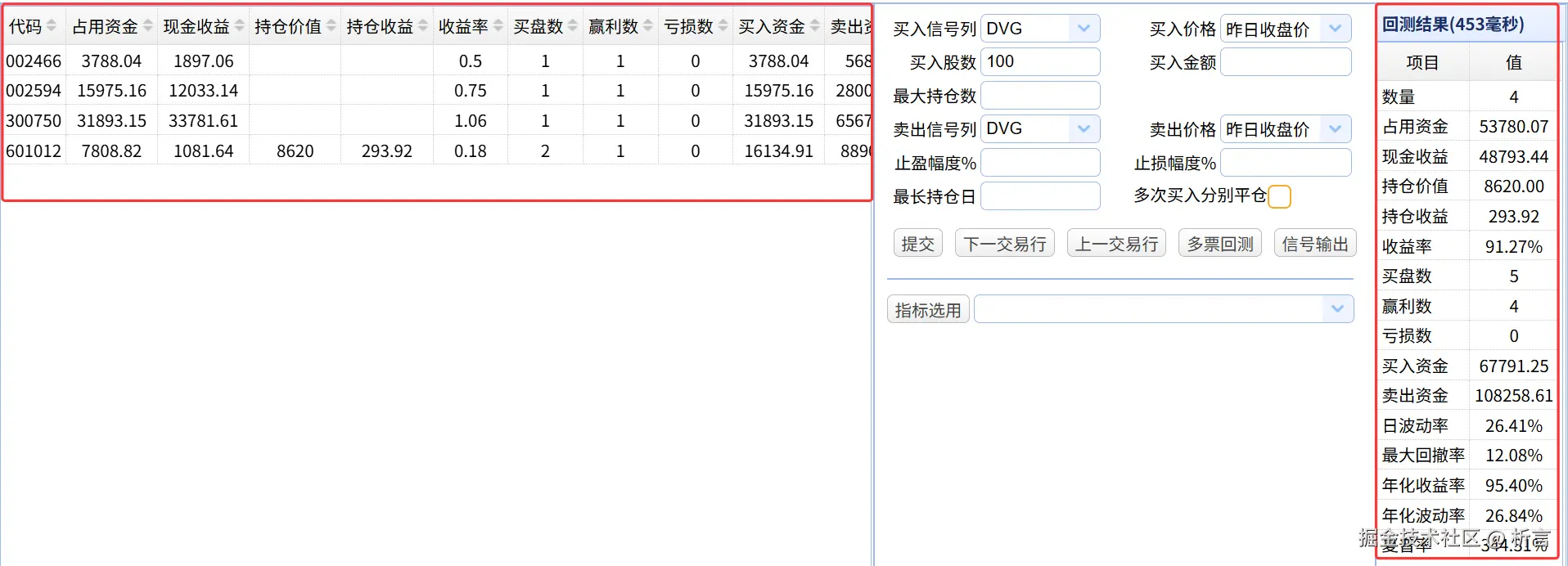 点击开始回测按钮后,可以在数据显示框里同时看到每只股票的回测结果: