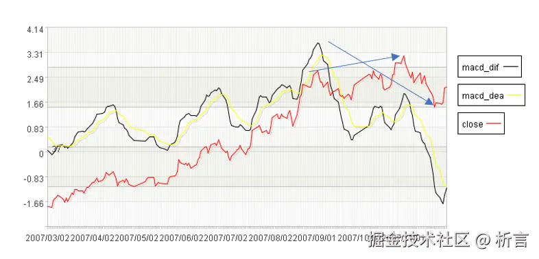 如下图箭头处,股票价格还在创新高,但 dif 指标背离式走低,出现顶背离。