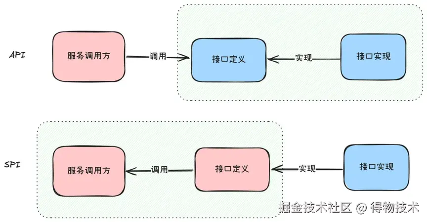 SPI:服务调用方负责接口定义,不同的接口实现方根据接口定义可以有不同的实现,能够在运行时动态的加载不用实现类,接口控制权在服务调用方。