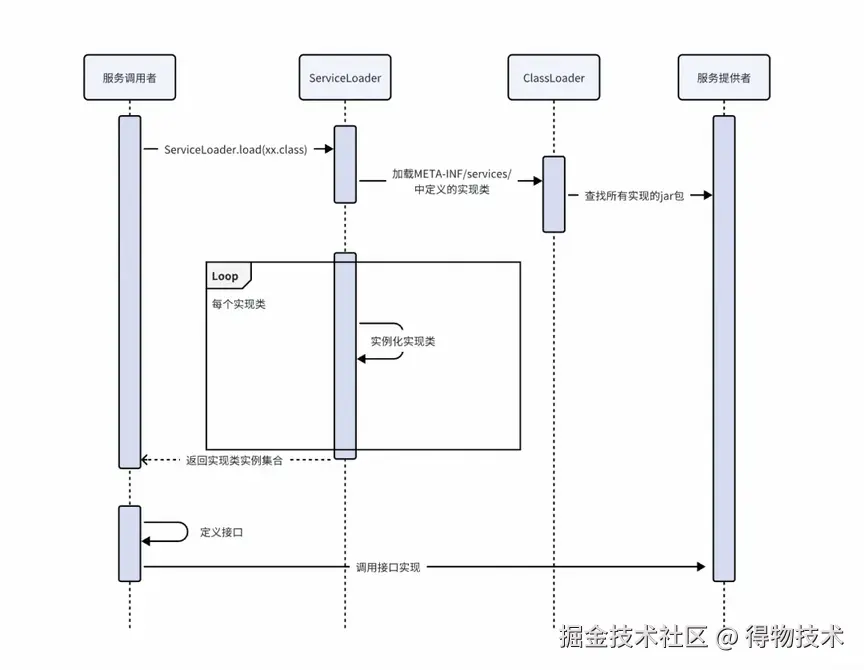 ServiceLoader 实现了 Iterable 接口的方法后,拥有了迭代的能力,在这个 iterator 方法被调用时,首先会在 ServiceLoader 的 Provider 缓存中进行查找,如果缓存中没有命中,则在 LazyIterator 中进行查找。