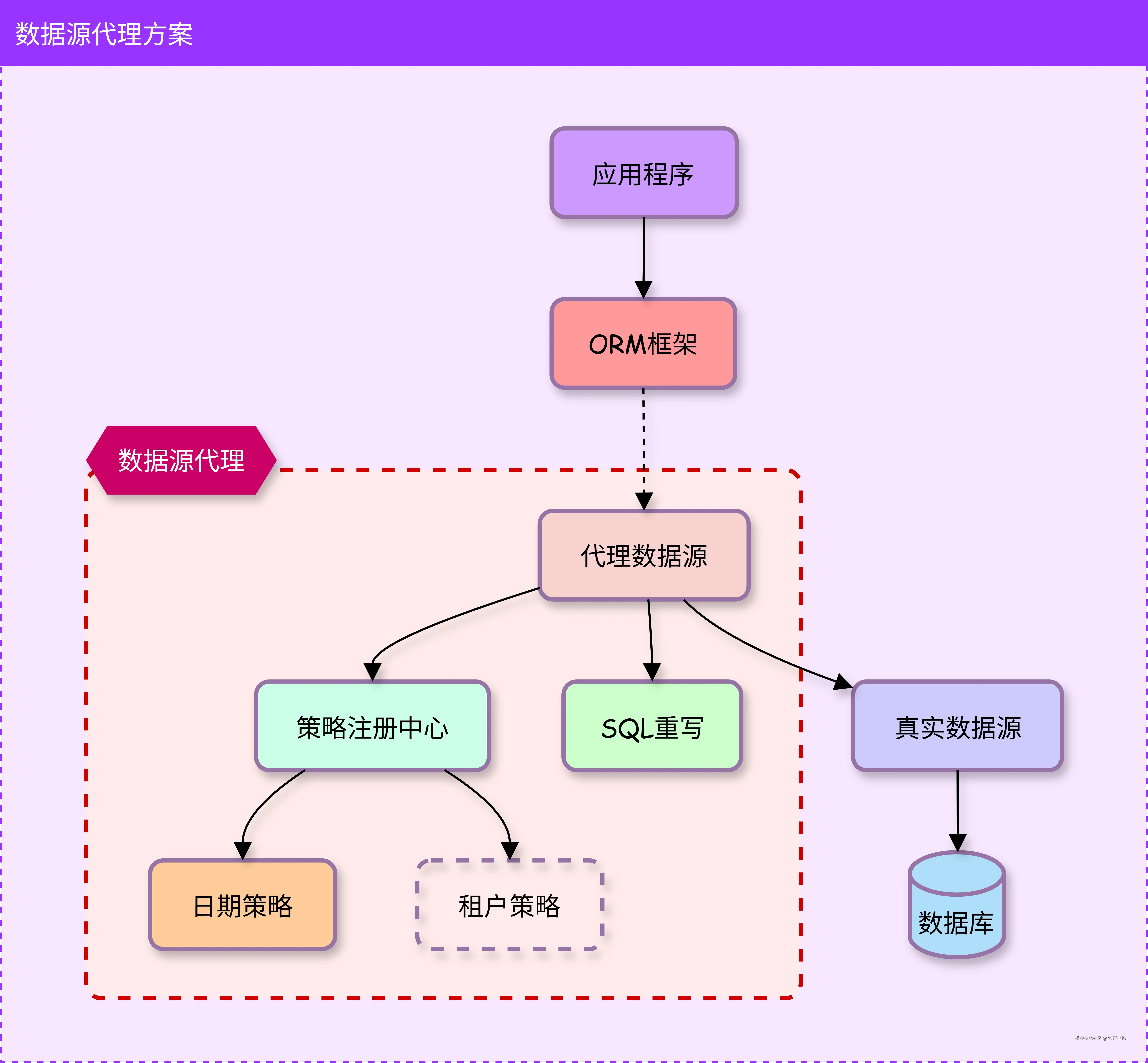 想不入侵 ORM 层和数据源,要做的就是在这中间加一个代理层,这样就会形成:ORM 层依赖数据源代理层,数据源代理层依赖真实的数据源。