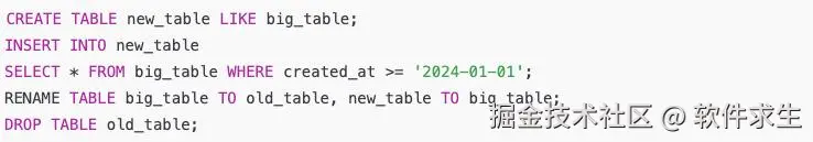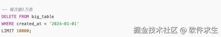 我一听这不就很简单嘛,想都没想就回了句:“那就 delete from big_table where created_at < '2024-01-01' 呗。”