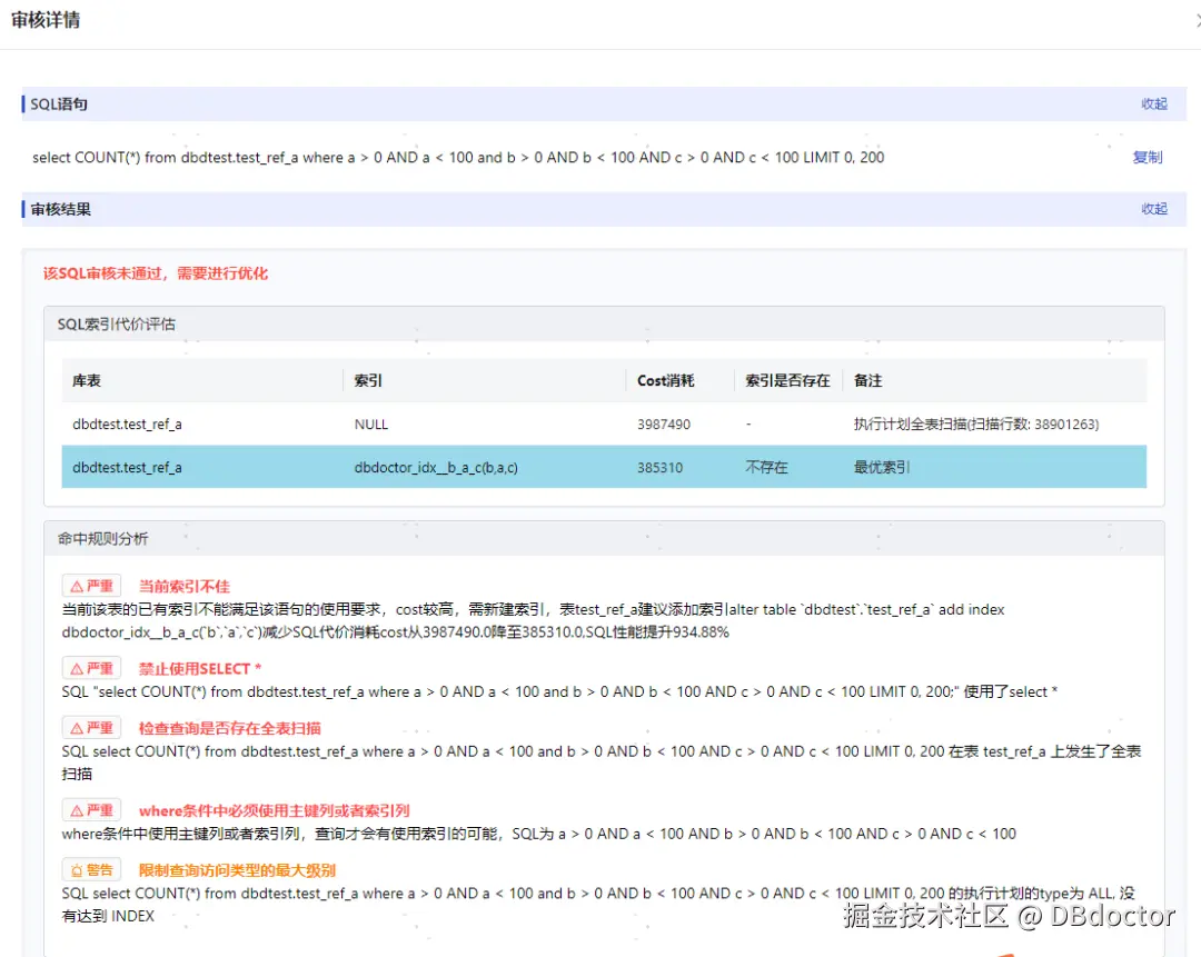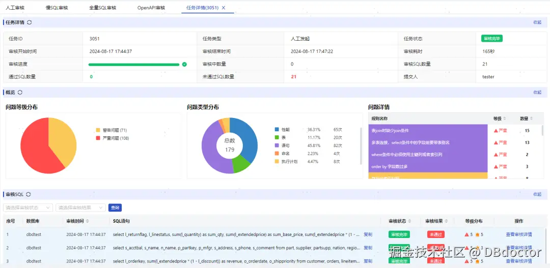 - 如下图所示,我们可以看到针对用户提交的批量SQL审核,可进行规则审核及性能审核