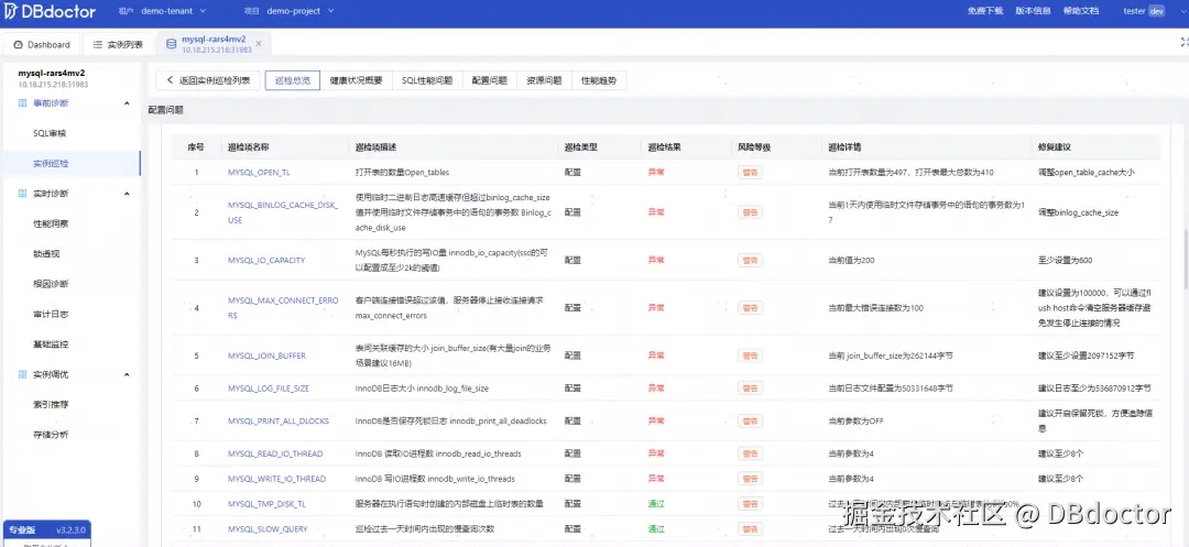 - 可体验巡检总览、监控状况概要、配置问题、资源问题、性能趋势等功能。