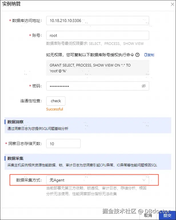数据库基本信息填写校验完成后,数据采集方式选择【无Agent】,点击提交即可完成无Agent实例纳管。选择该方式后,将不会再到目标机器上进行Agent安装。