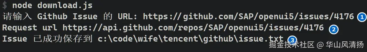 执行之后,输入要下载的 Github issue url,工具就会打印出实际的 Github API url,并将该 issue 的内容通过 https 读取到本地,另存为 text 文件。