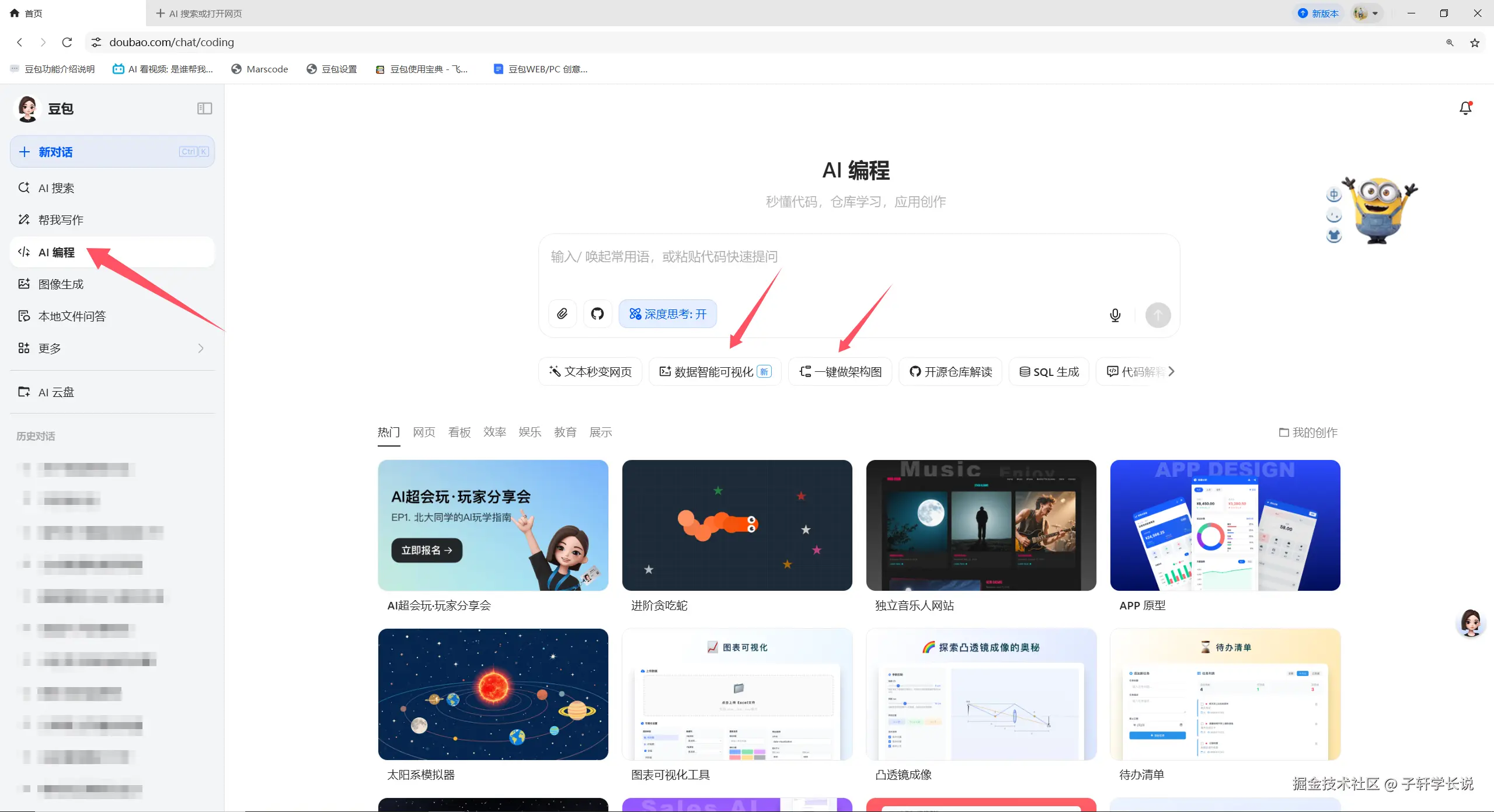 仍然是打开豆包电脑版,左侧点击进入ai编程功能,然后可以直接选择左下角的数据智能可视化。