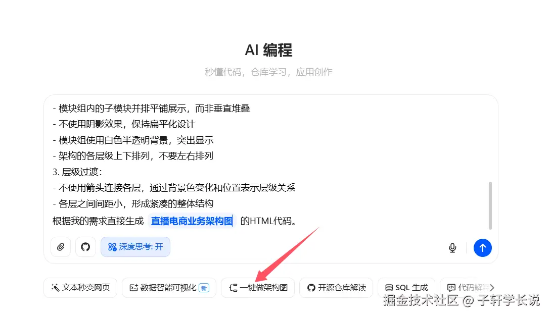 再试试架构图也一样,主页点击一键架构图,提示词模版都给你填好了,然后只需要改蓝色字部分就可以了。