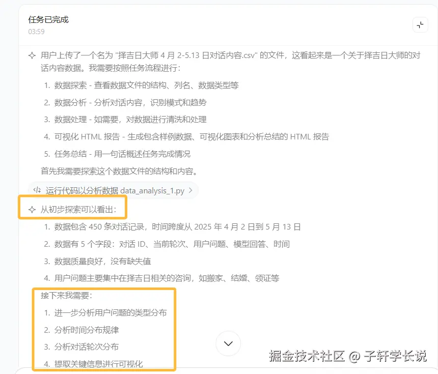 可以看到ai的思考过程,会先分析里面的数据,得到结果后,将结果选择合适的数据图形式,柱图还是折线图,反应不同的数据类型,然后剩下的就是编程完成了。